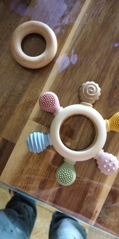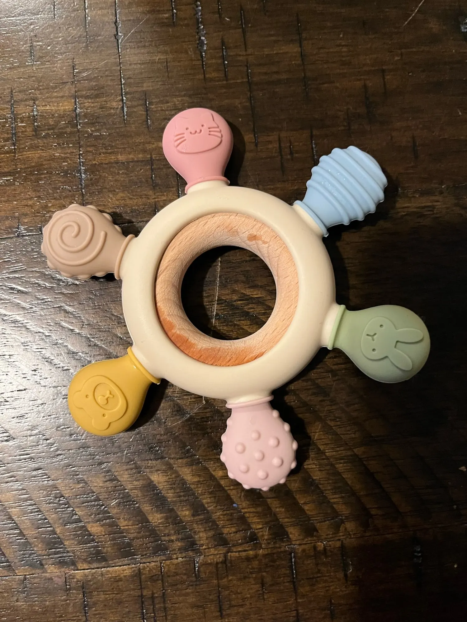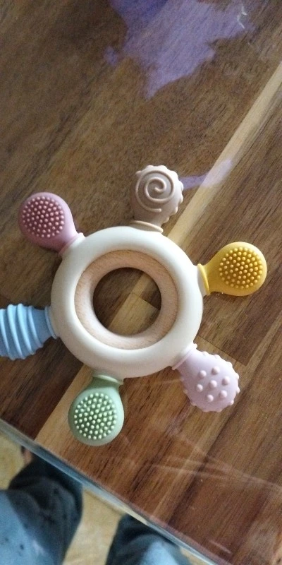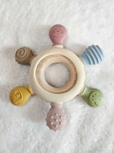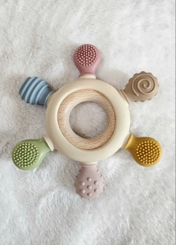 Featuring six fun silicone tips and a smooth wooden ring, it's easy for tiny hands to hold. The natural wood center not only supports motor development but also helps teeth break through the gums and speeds up teething. Safe, non-toxic, and easy to clean-it's the perfect companion for soothing, engaging, and supporting your baby's early development.